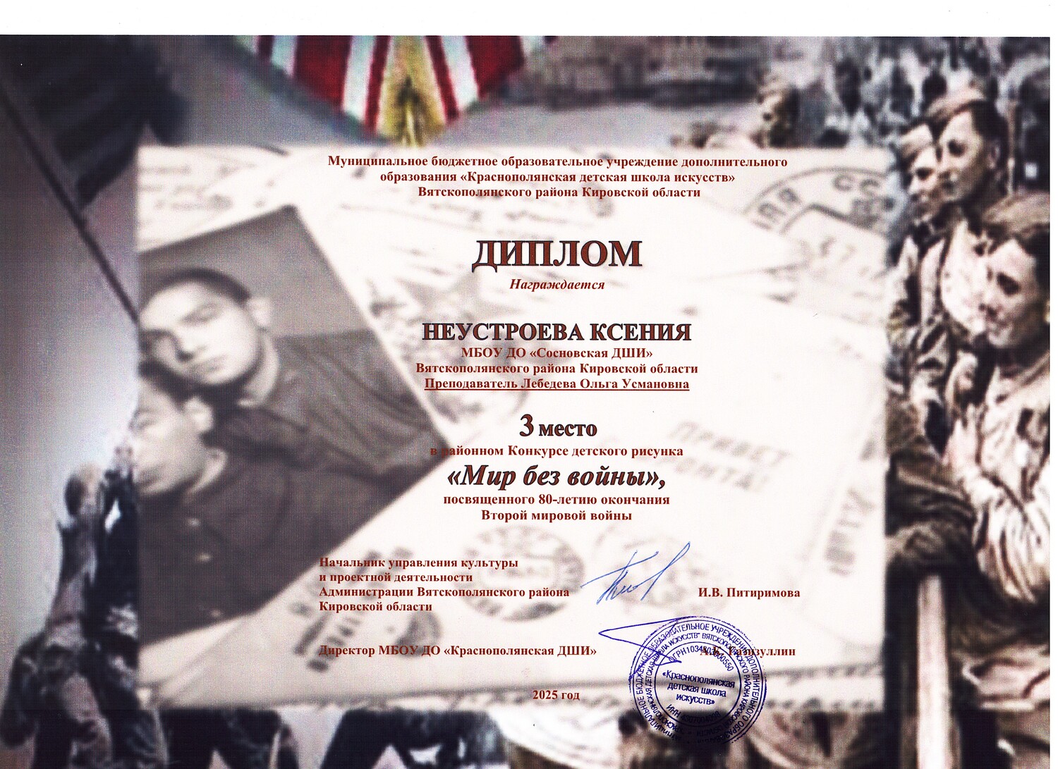 Поздравляем победителей районного конкурса детского рисунка "Мир без войны", посвященного 80-летию окончания Второй мировой войны. Прикрепления: