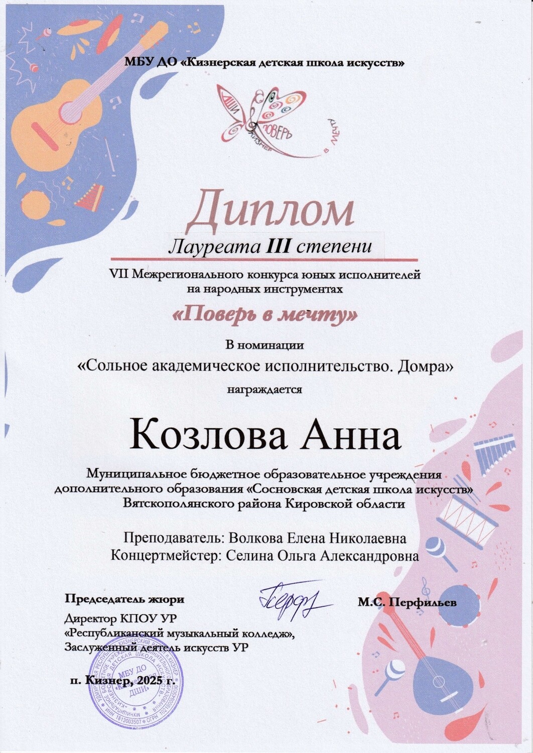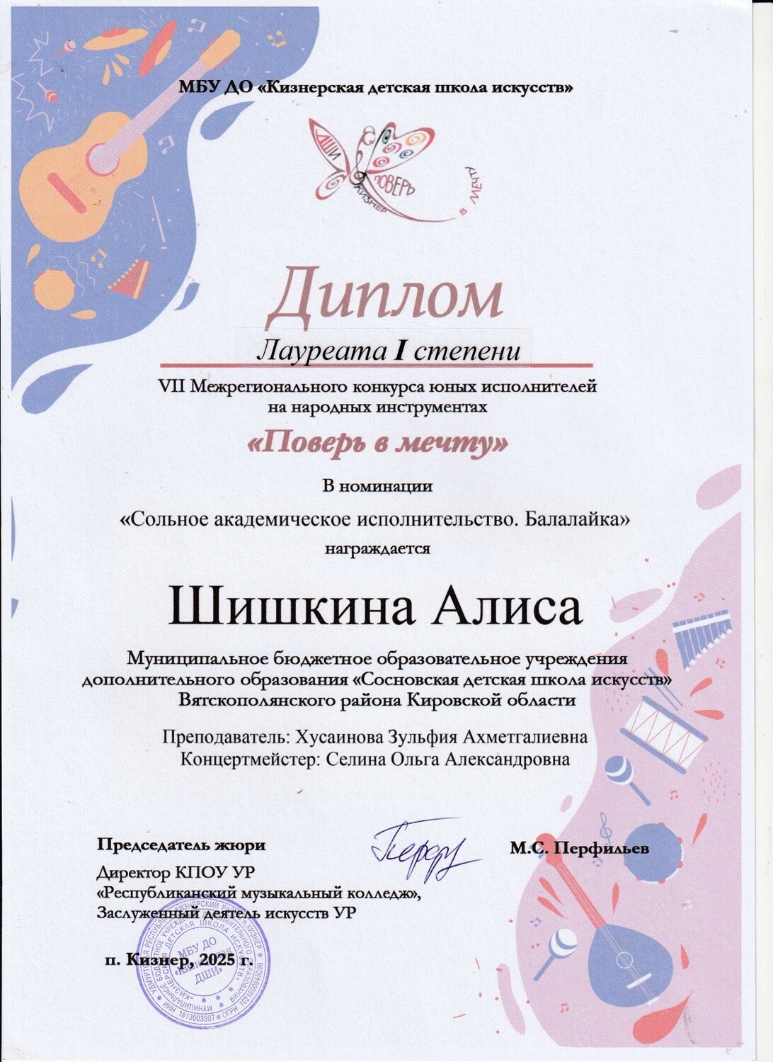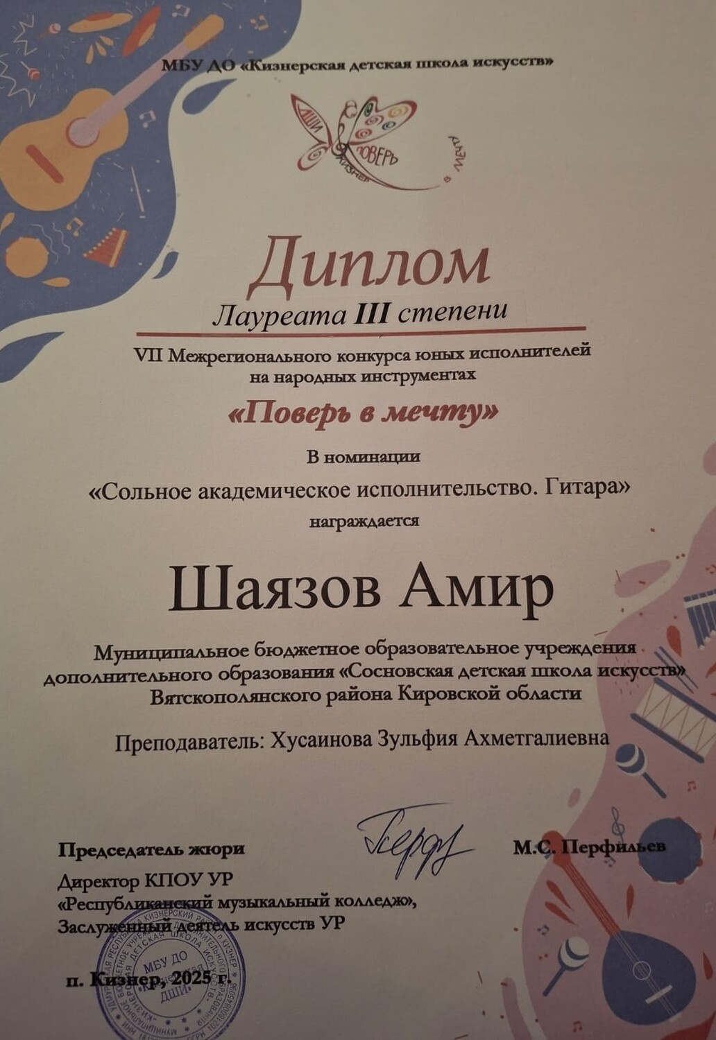 - VII Межрегиональный конкурс юных исполнителей на народных музыкальных инструментах «ПОВЕРЬ В МЕЧТУ!», п. Кизнер: Шишкина Алиса - Лауреат I степени, Шаязов Амир - Лауреат III степени, Щербаков Глеб - Лау