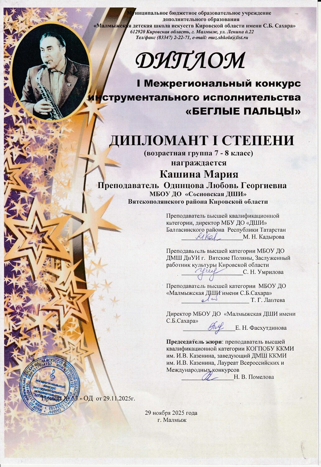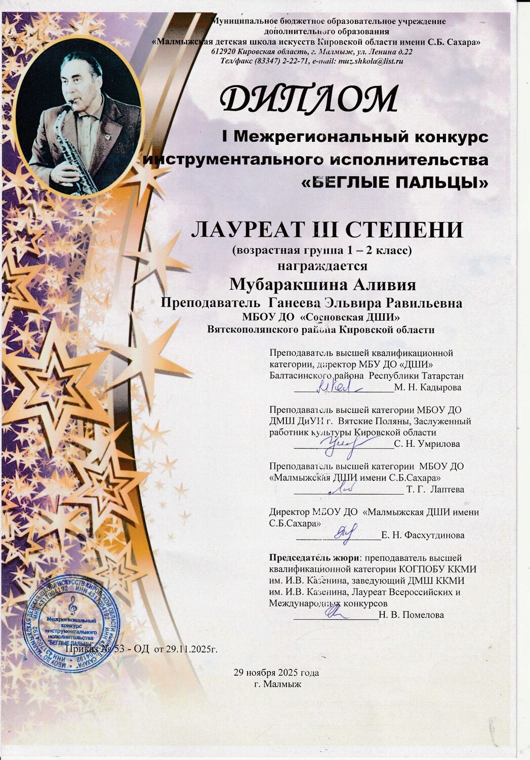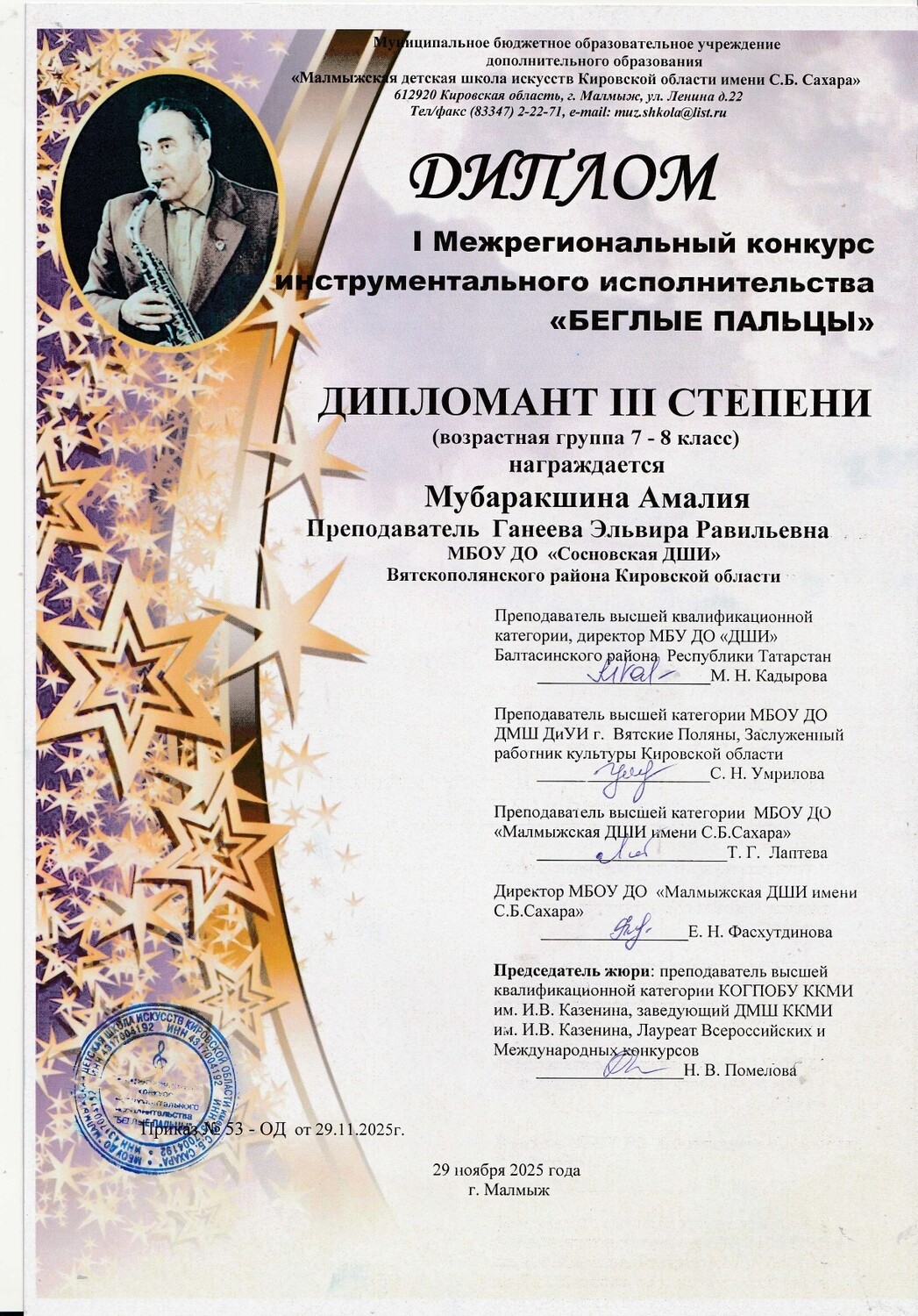 - I Межрегиональный конкурс инструментального исполнительства «Беглые пальцы», г. Малмыж: Мубаракшина Аливия - Лауреат III степени, Овчинникова Ксения – Лауреат III степени, Кашина Мария - Дипломант I степени, Мубаракшина Амалия – Дипломант III степени,