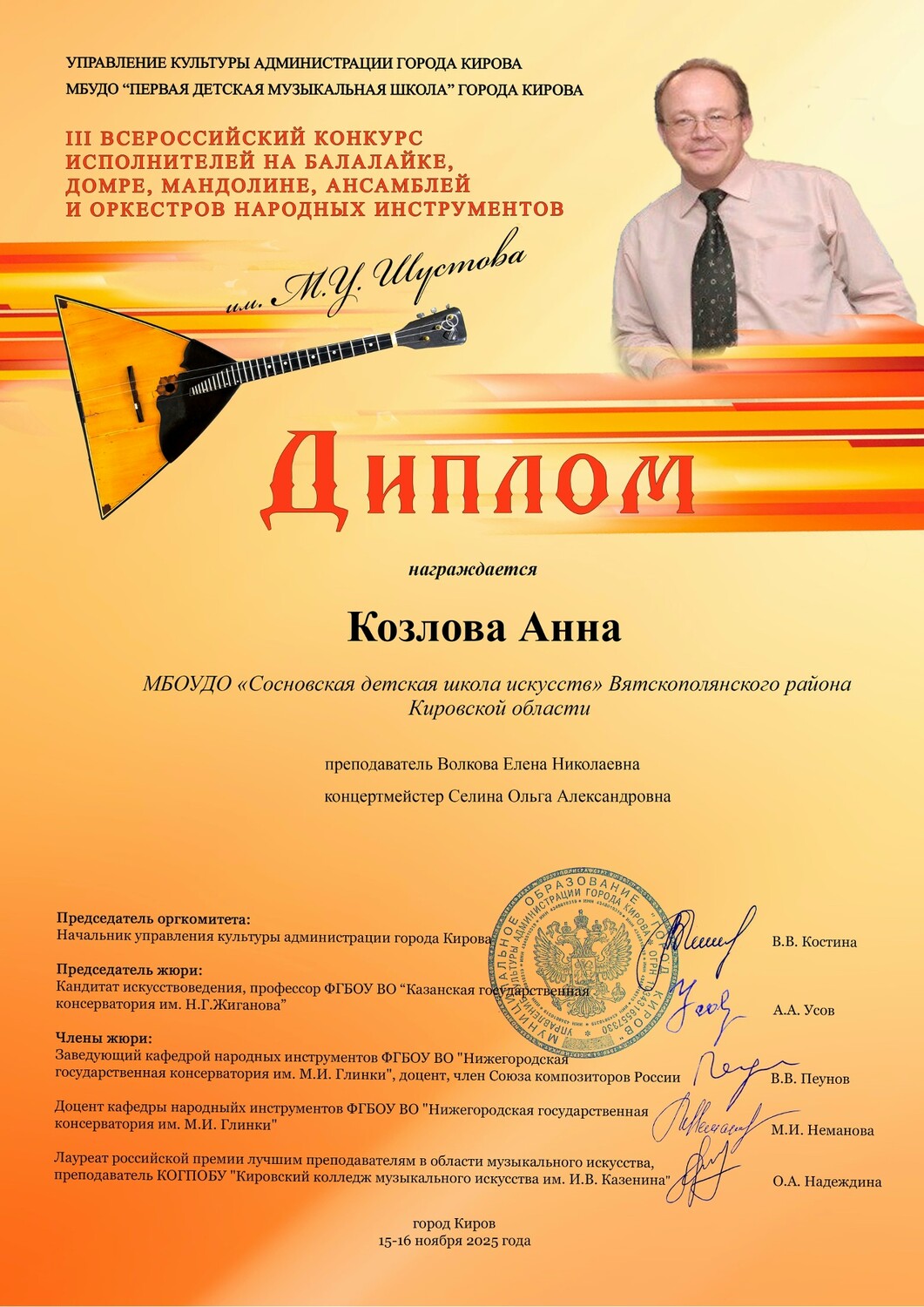- III Всероссийский конкурс исполнителей на балалайке, домре, мандолине, ансамблей и оркестров народных инструментов им. М.У. Шустова, г. Киров: Козлова Анна – Диплом, Шишкина Алиса – Диплом, Исакова Аглая – Диплом;